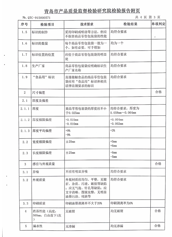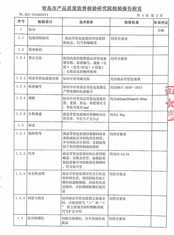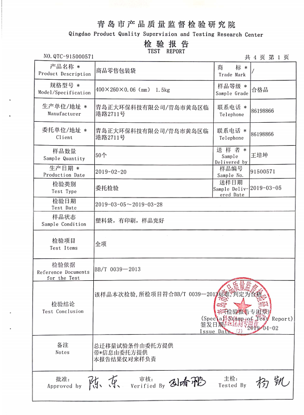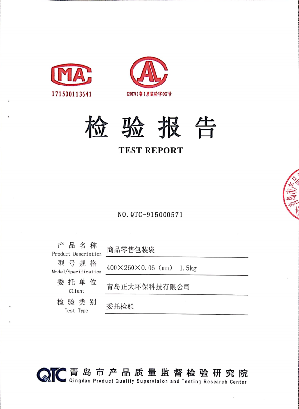 青島正大環(huán)保生產(chǎn)的零售商品包裝袋400*260*0.06mm順利通過青島質(zhì)量監(jiān)督檢查院檢測(cè)