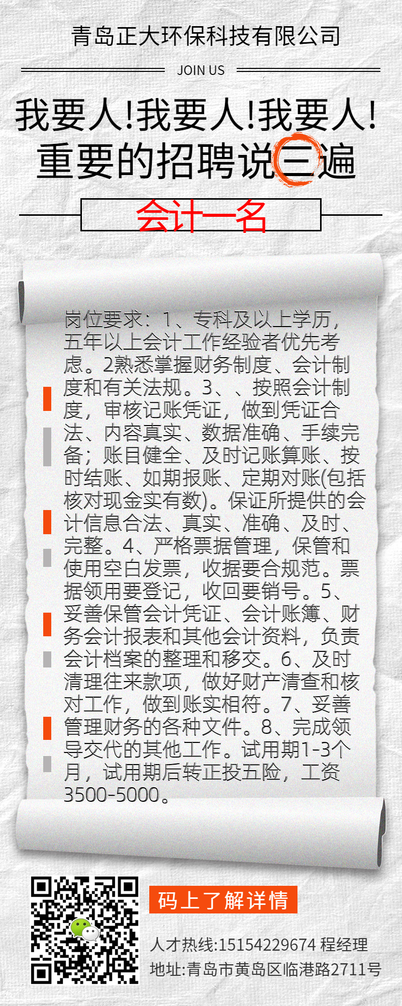 青島正大環(huán)保科技有限公司招聘會計一名待遇從優(yōu),